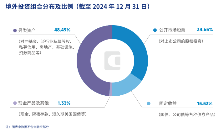 具体来看,截至2024年末,中投公司境外投资组合分布比例分别是,另类资产48.49%、公开市场股票34.65%、固定资产15.53%和现金产品及其他1.33%。