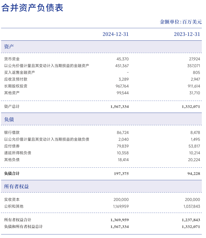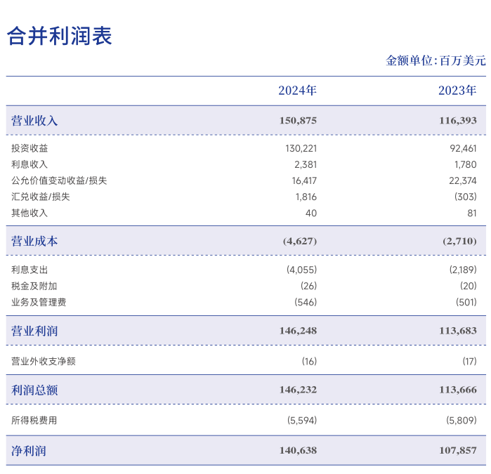 2024年,中投公司实现营业收入1508.75亿美元,较2023年的1163.93亿美元增长29.62%;投资收益为1302.21亿美元,较2023年的924.61亿美元增长40.84%;净利润为1406.38亿美元,较2023年的1078.57亿美元增长30.40%。