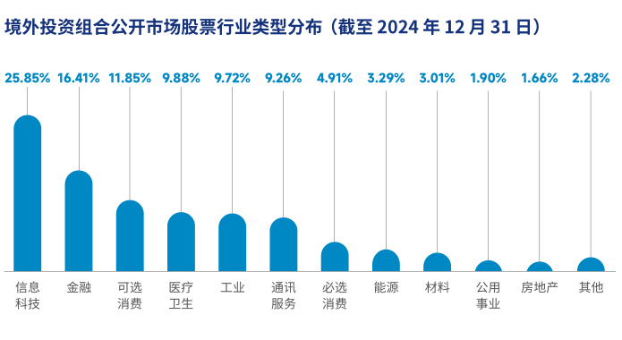 从中投公司2024年末的境外投资组合公开市场股票行业类型分布来看,信息科技占比最高,达25.85%;金融和可选消费紧随其后,分别占比16.41%和11.85%;医疗卫生、工业和通讯服务占比也都超过9%;必选消费、能源、材料、公用事业、房地产行业也均有涉猎。